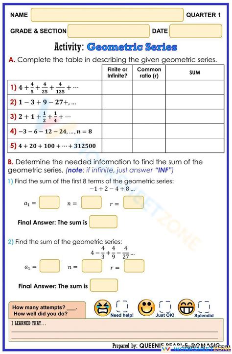 Geometric Series Worksheet. Web these worksheets introduce the concepts of arithmetic and geometric series. Web the geometric sequences worksheets for the little minds is a fun way to interact with sequences.