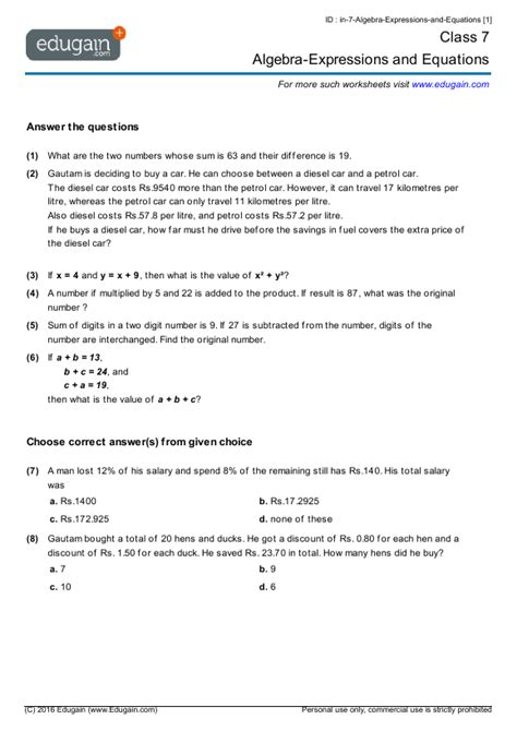 Algebra worksheets grade 7 10; Free interactive exercises to practice online or download as pdf to print. Gn tutorials maths worksheet on simple equations.