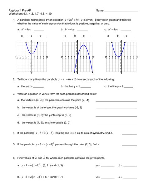 Web these worksheets explain how to graph parabolas and write the standard equations for parabolas. Web worksheets are equations of parabolas, vertex form of parabolas, unit 2 2 writing and graphing quadratics work, graphing parabolas given the vertex form of the equation, conic sections review work 1, work quadratic functions, graphing from vertex form work, sketch the graph of each plot at least 5 points. Parabolas have a line of symmetry and > 0 for a < 0 shape as shown.
